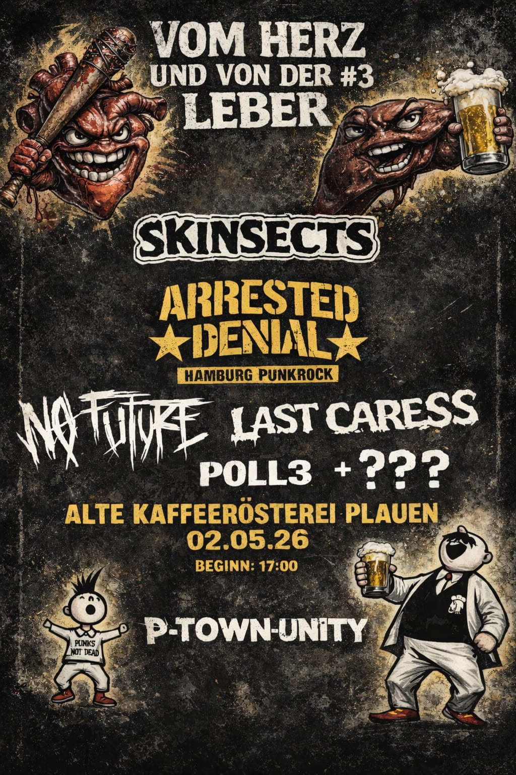 Zusammen mit Skinsects, Arrested Denial, No Future, Last Caress und Poll3 wollen wir mit euch wieder den ganzen Abend in der Röste feiern. Eine weitere Band ist in Planung ☝️