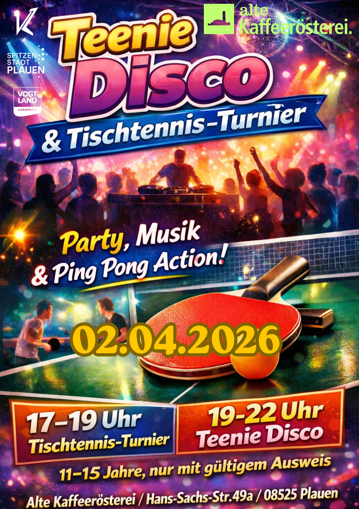 Am 02.04.26 ,17 Uhr ist es wieder soweit... Teenie Disco meets Tischtennis- Turnier... Anmeldung bis 17.15 Uhr... zocken ist angesagt.... Preise abräumen und zur Mukke von DJ Freed abtanzen... Start: 17 Uhr Ende: 22 Uhr Saal: DJ Fred82 Eintritt: 4,- EUR Altersbegrenzung : 11 Jahre bis 15 Jahre Specials: , Musikwunsch beim DJ , alkoholfreie Cocktails 4,- Euro.