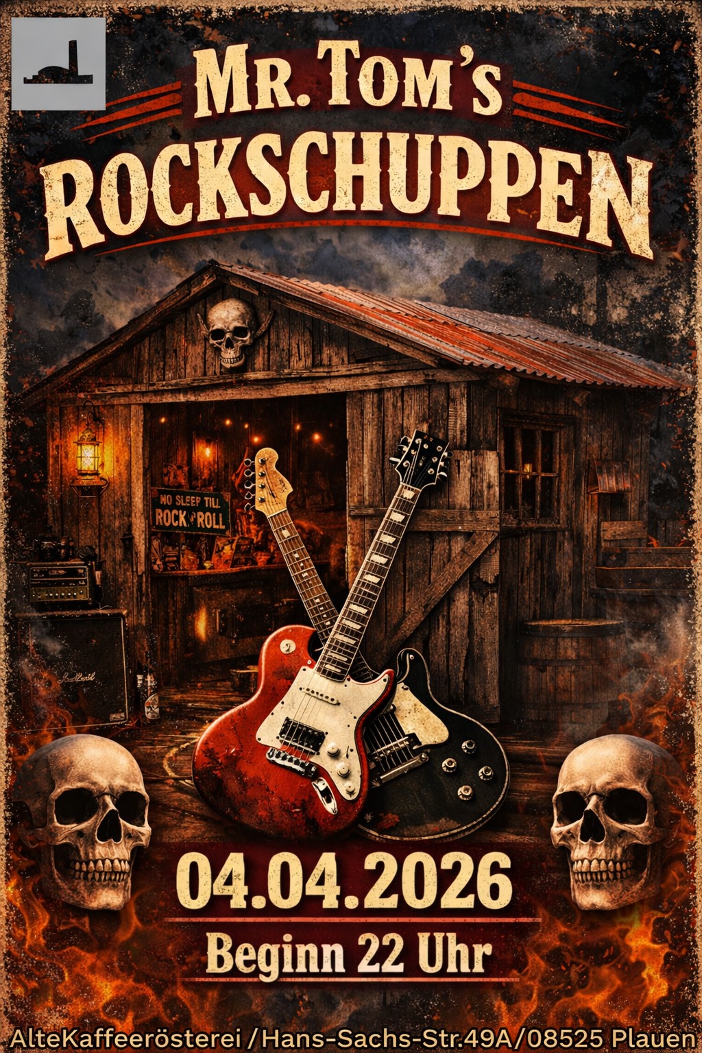 Rocknacht in Plauen! Am 04.04.2026 bringt Mr. Tom’s Rockschuppen die Alte Kaffeerösterei zum Beben. Ab 22 Uhr gibt’s eine fette Mischung aus Metalcore, Alternative, Rock und Nu-Metal – laut, roh und direkt auf die Zwölf.